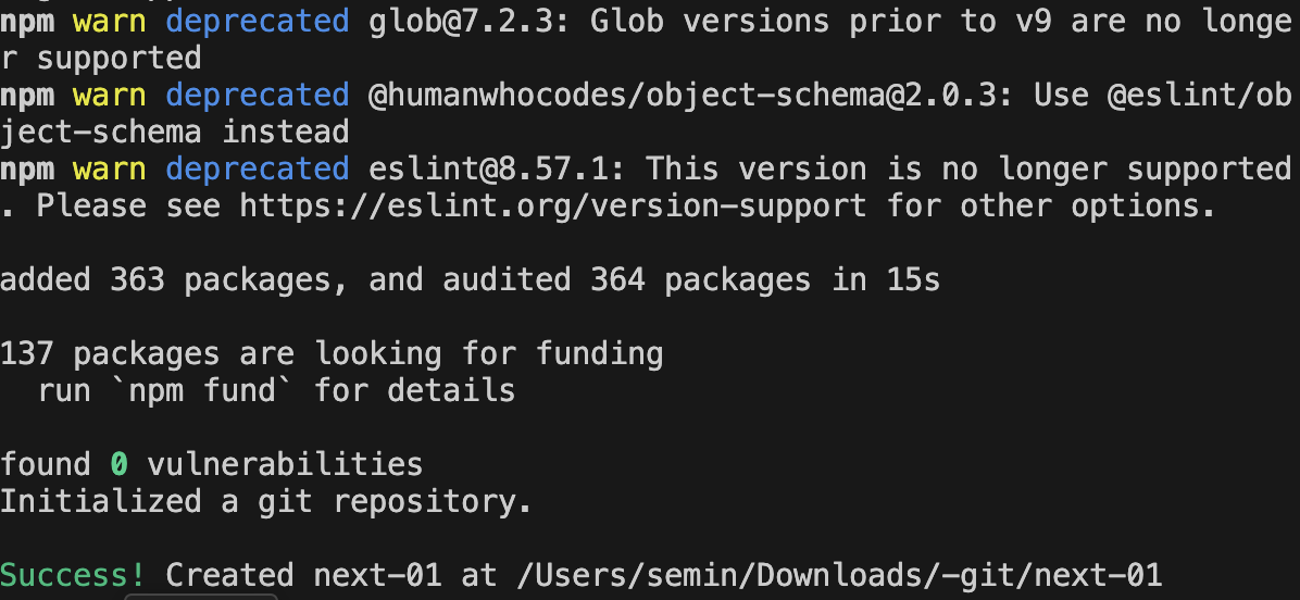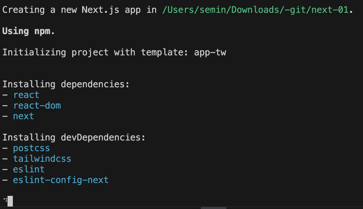 그리고 하단의 npx create-next-app@latest ./ 복사 붙여넣기 후 엔터